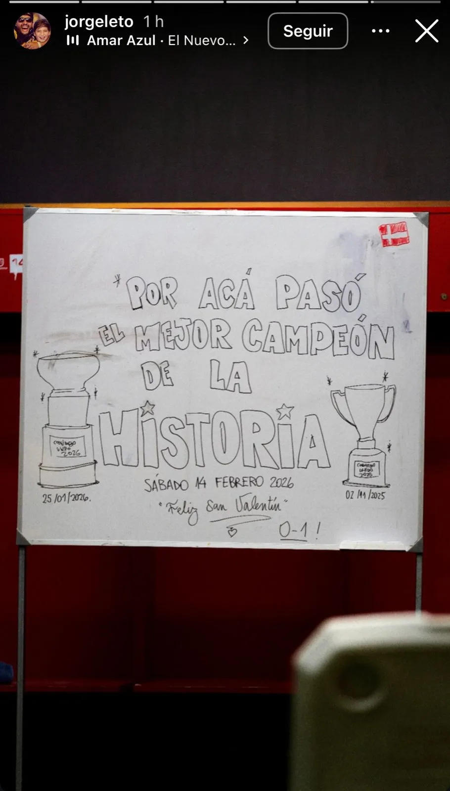 “Por acá pasó el mejor campeón de la historia”, fue lo que escribieron en una pizarra, dibujando los títulos del torneo nacional y la Supercopa y además, deseando un Feliz San Valentín a su clásico rival tras esta victoria por 1-0.