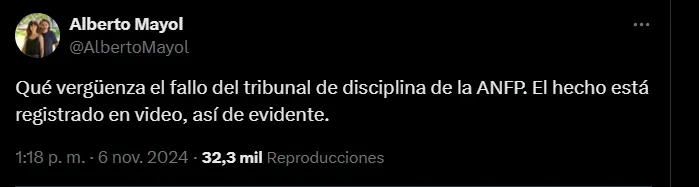 “Qué vergüenza el fallo del tribunal de disciplina de la ANFP. El hecho está registrado en video, así de evidente”, escribió Mayol en la ex red del pajarito azul.