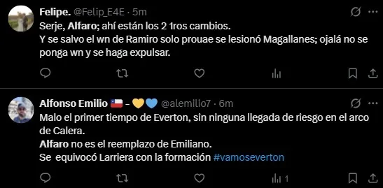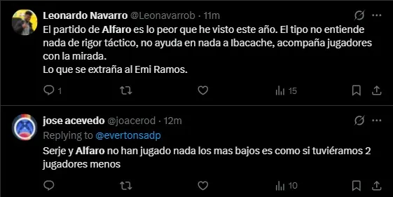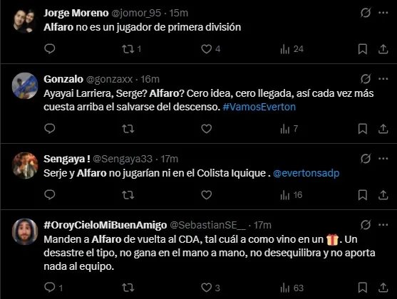 Las críticas no se quedaron ahí. “El partido de Alfaro es lo peor que he visto este año”, “Serje y Alfaro no han jugado nada”, “Alfaro no es reemplazo de Emiliano (Ramos)”, lanzaron hinchas de Everton.