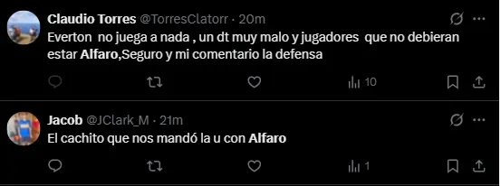 “El cachito que nos mandó la U”, “Manden a Alfaro de vuelta al CDA”, “Alfaro no es jugador de Primera División”, “Serje y Alfaro no jugarían ni en el colista”, fueron algunos de los comentarios de los hinchas del cuadro viñamarino a través de la red social X.