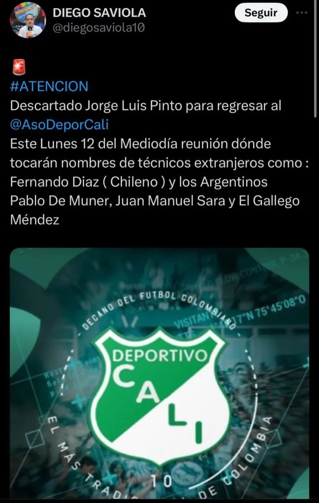 El periodista colombiano, Diego Saviola informó que el club de Cali está analizando opciones para escoger a su nuevo entrenador para esta temporada, en la que aparece el nombre del entrenador de Coquimbo Unido, Fernando Díaz.