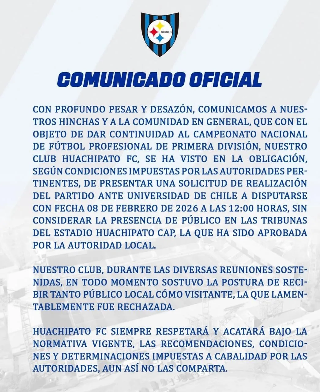 A través de un comunicado oficial, el conjunto siderúrgico expresó su “profundo pesar y desazón” ante la medida. Según explicaron, el club se vio en la “obligación” de presentar la solicitud sin público para acatar las condiciones impuestas por las autoridades pertinentes y así garantizar la continuidad del Campeonato Nacional 2026.
