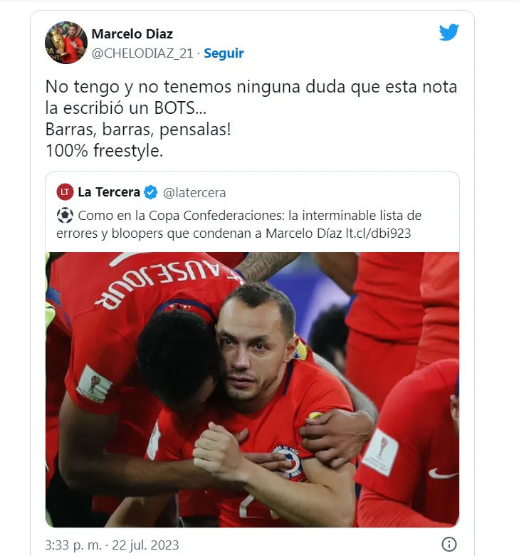 “No tengo y no tenemos ninguna duda que esta nota la escribió un BOTS”, escribió el bicampeón de América con la Roja en Twitter.