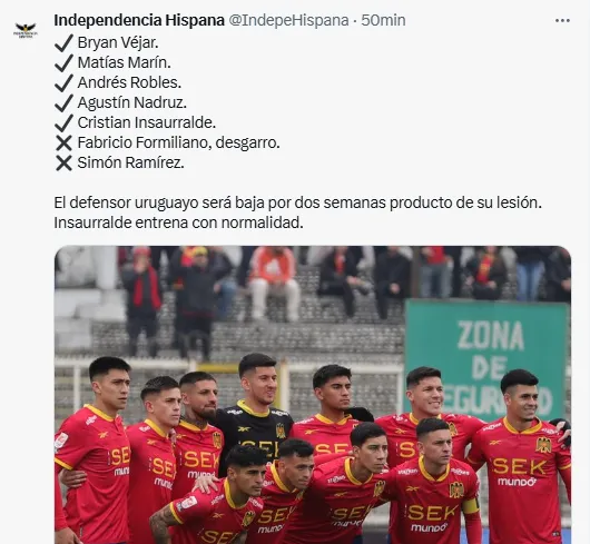 Pero no todas son buenas para los ‘Hispanos’, ya que Ramírez indicó que Simón Ramírez y Fabricio Formiliano no serán parte del próximo duelo, señalando que este último sufrió un desgarro y estaría dos semanas fuera de las canchas.