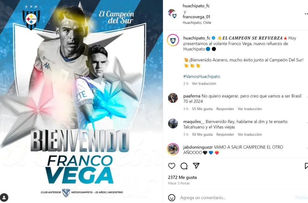 “El campeón se refuerza. Hoy presentamos al volante Franco Vega, nuevo refuerzo de Huachipato. Bienvenido Acerero, mucho éxito junto al Campeón del Sur”, comunicaron vía redes sociales.