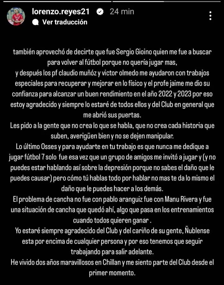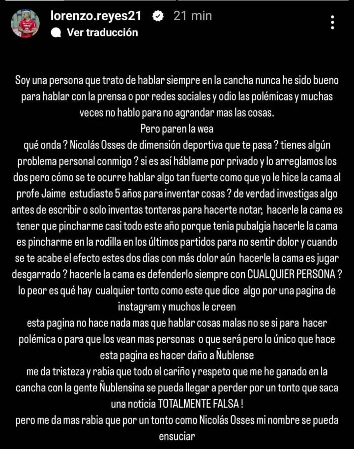 Reyes además confiesa que todo esto “me da tristeza y rabia que todo el cariño que me he ganado en la cancha con la gente ñublesina se puede llegar a perder por un tonto que saca una noticia TOTALMENTE FALSA”.