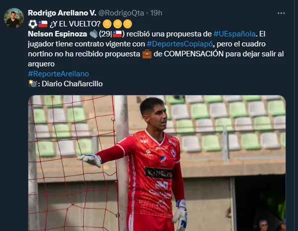 “Nelson Espinoza recibió una propuesta de Unión Española. El jugador tiene contrato vigente con Deportes Copiapó, pero el cuadro nortino no ha recibido propuesta de compensación para dejar salir al arquero”, declaró.
