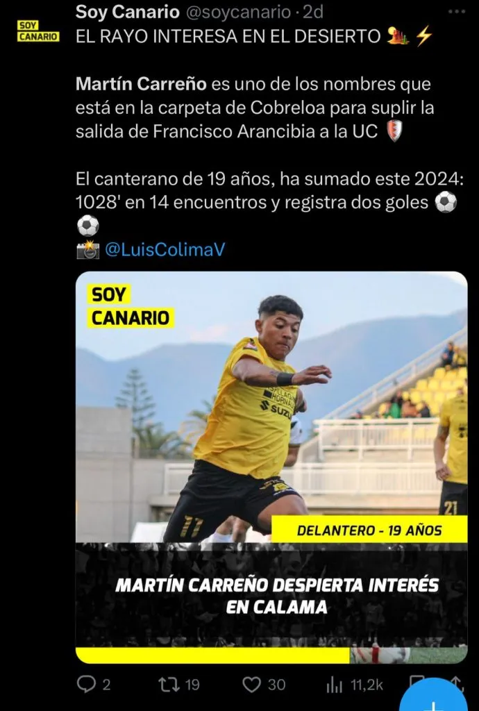 “El rayo interesa en el desierto. Martín Carreño es uno de los nombres que está en la carpeta de Cobreloa para suplir la salida de Francisco Arancibia a la UC”, informaron.