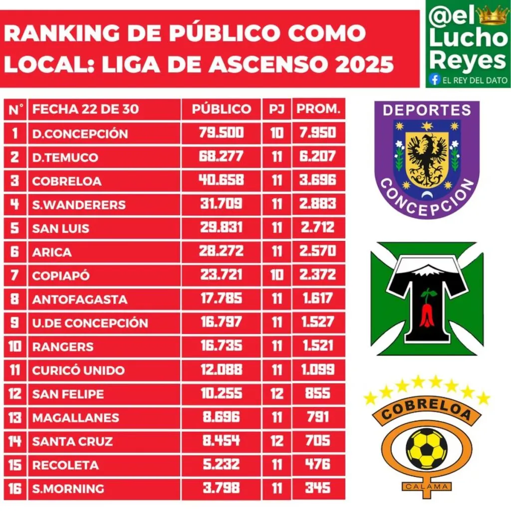 Más atrás aparecen los mencionados “Zorros”. Bastante atrás, de hecho. 40.658 personas han asistido a los duelos de Cobreloa en Calama en 11 partidos, promediando 3.696 almas por cada duelo. Los “Caturros” por su parte no entraron en el podio, ya que aparecen bastante más atrás con 31.709 personas, con un promedio de 2.883 por compromiso.