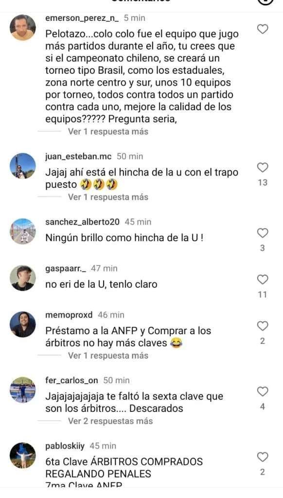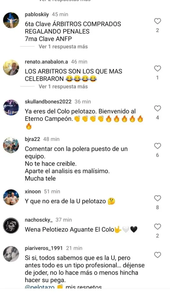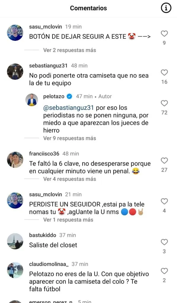 Algunos comentarios fueron tajantes y le dijeron: “No podí’ ponerte otra camiseta que no sea la de tu equipo”. Otros le recalcaron: “Perdiste un seguidor” mientras que los más lapidarios le dijeron derechamente: “No eres de la U”.