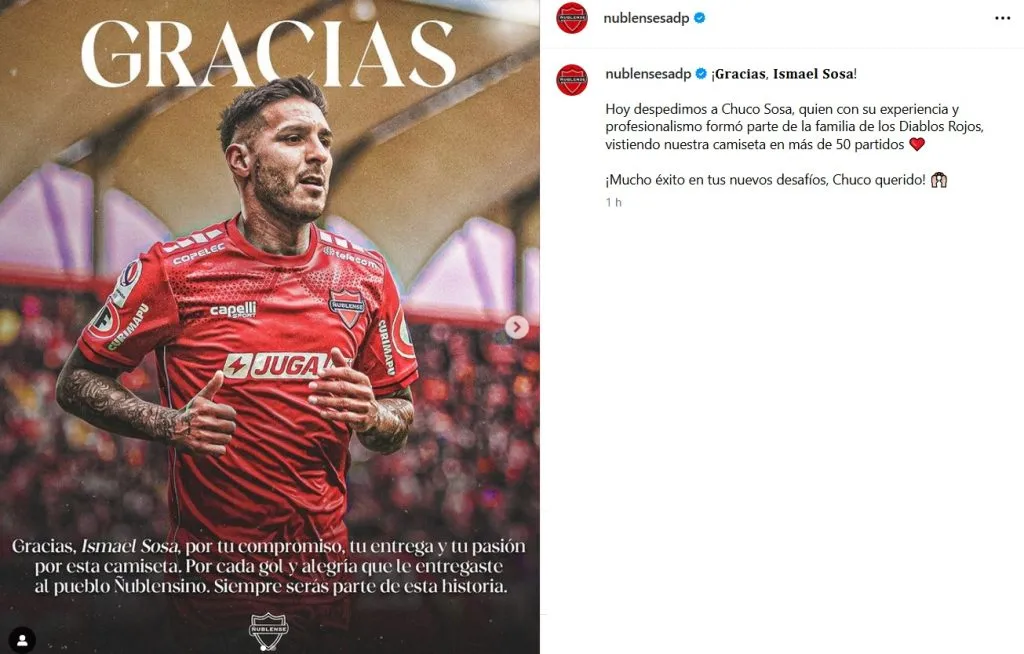 “Gracias, Ismael Sosa por tu compromiso, tu entrega y tu pasión por esta camiseta. Por cada gol y alegría que le entregaste al pueblo Ñublensino, siempre serás parte de la historia”, dice el texto de una foto que compartieron.