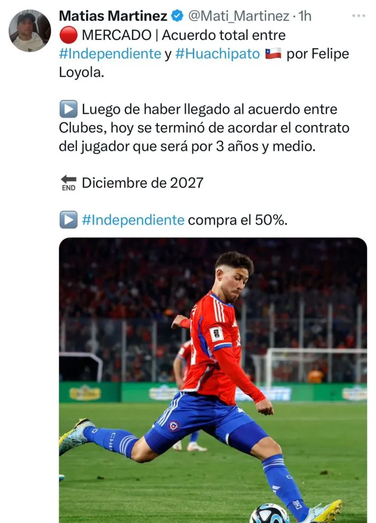 El periodista Matías Martínez que cubre al equipo argentino, dio a conocer en X (ex Twitter) que el jugador de 23 años cruzará la cordillera y firmará un contrato por tres años, hasta diciembre de 2027.