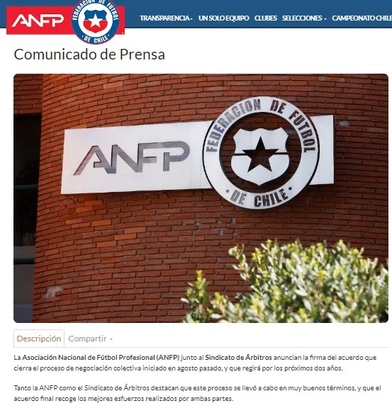 “La Asociación Nacional de Fútbol Profesional junto al Sindicato de Árbitros anuncian la firma del acuerdo que cierra el proceso de negociación colectiva iniciado en agosto pasado, y que regirá por los próximos dos años”.