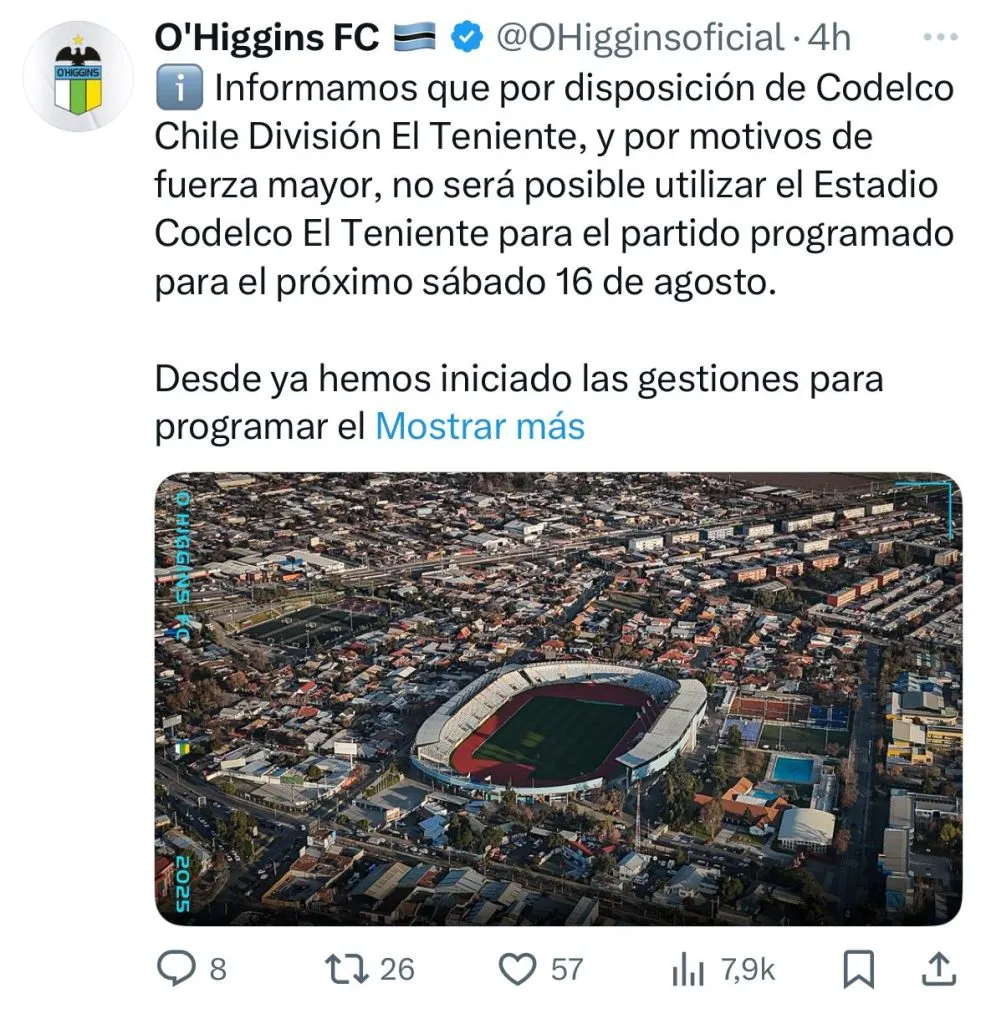 Informamos que por disposición de Codelco Chile División El Teniente, y por motivos de fuerza mayor, no será posible utilizar el Estadio Codelco El Teniente para el partido programado para el próximo sábado 16 de agosto. Desde ya hemos iniciado las gestiones para programar el partido ante Cobresal en el Estadio Jorge Silva Valenzuela de San Fernando”.