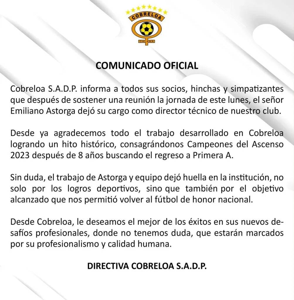 “Cobreloa S.A.D.P informa a todos sus socios, hinchas y simpatizantes que después de sostener una reunión la jornada de este lunes, el señor Emiliano Astorga dejó su cargo como director técnico de nuestro club“, informaron.