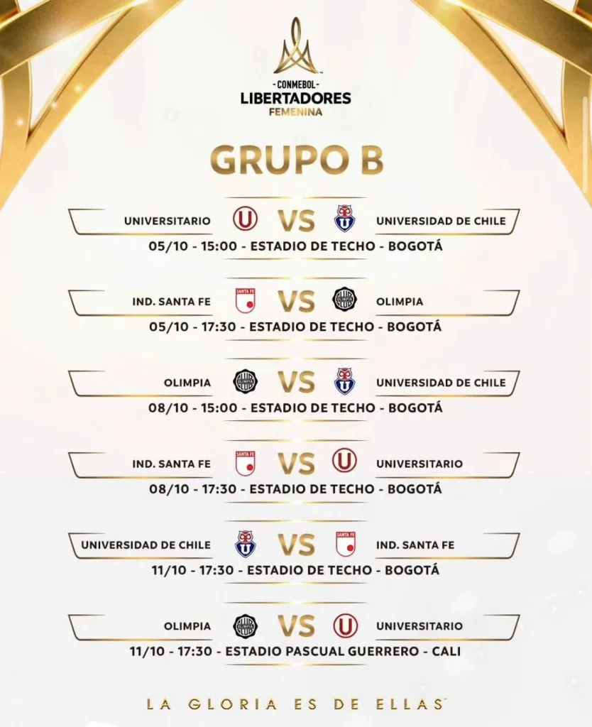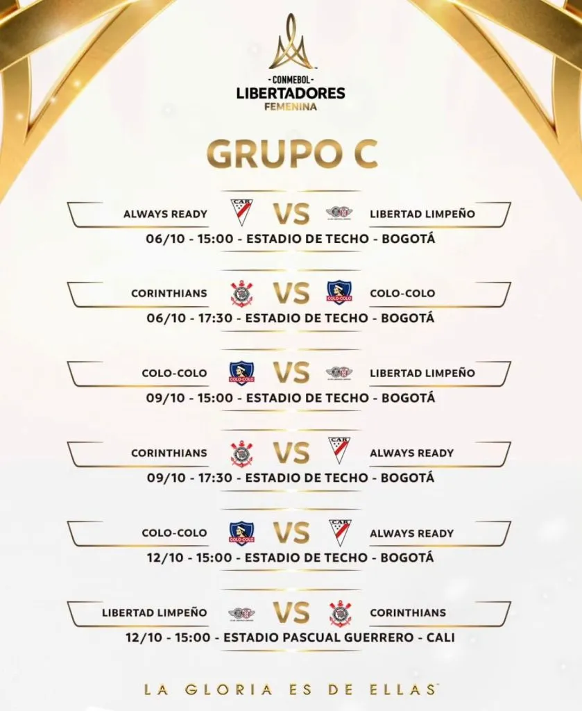 Por otra parte, Colo Colo también jugará en Bogotá sus tres encuentros de la fase de grupos, en donde en la primera fecha se enfrentarán ante Corinthians el 6 de octubre a partir de las 19:30 horas, luego el 9 del mismo mes se enfrentarán a Always Ready a las 17:00 horas y su último duelo será ante Libertad Limpeño el 12 de octubre a las 17:00.