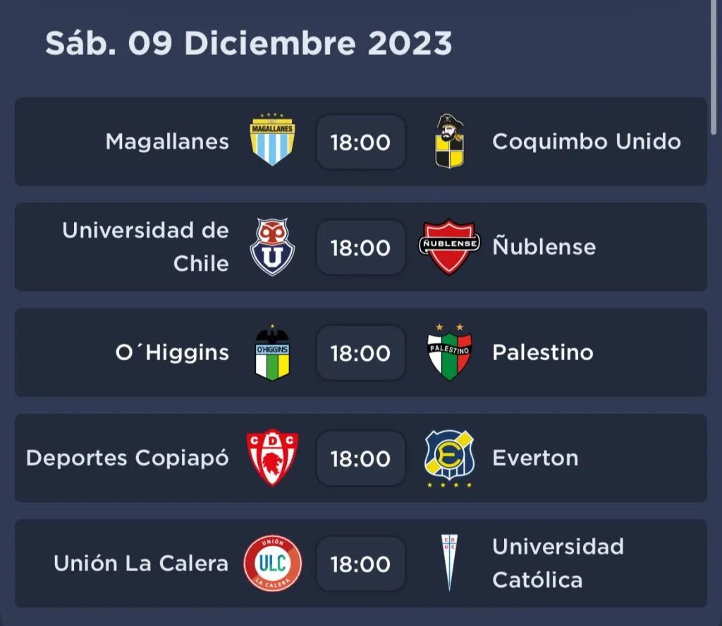 De ahí en más, la Gerencia de Ligas -hace instantes- dio a conocer la nueva programación y los partidos se jugarán a las 18 horas. Magallanes y Copiapó pelean por el segundo descenso, en tanto las universidades y los caleranos están bregando por llegar a la Sudamericana.