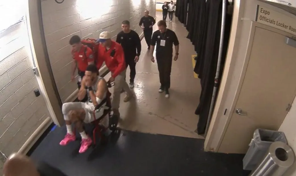 La fuerte caída, obligó a la estrella de los Celtics a ser retirado en silla de ruedas y con lágrimas en los ojos, evidentemente afectado por la gravedad de la lesión.