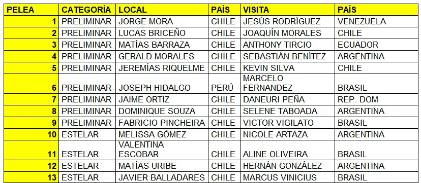 La jornada contará con 3 combates femeninos, donde la chilena Valentina Escobar enfrentará a la brasileña Aline Oliveira, mientras que nuestra también compatriota Melissa Gómez, que viene de triunfar en Estados Unidos, tendrá la difícil misión de derrotar a la argentina Nicole Artaza.