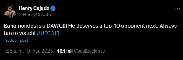 Pero no fue el único que quedó gratamente sorprendido con la pelea del chileno, pues Henry Cejudo, freestyle wrestler y artista marcial mixto estadounidense de ascendencia mexicana que logró la medalla de oro en la categoría de las 121 libras en los Juegos Olímpicos del año 2008, también tuvo palabras para Bahamondes.