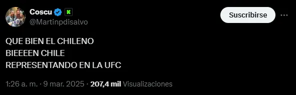 “QUE BIEN EL CHILENO BIEEEEN CHILE REPRESENTANDO EN LA UFC”, escribió en su cuenta de X (Ex Twitter).