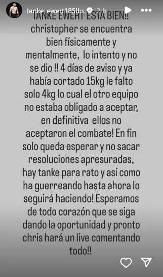 “Christopher se encuentra bien física y mentalmente. Lo intentó y no se dio. Cuatro días de aviso y ya había cortado 15 kilos le faltó solo cuatro kg lo cual el otro equipo no estaba obligado a aceptar, en definitiva ellos no aceptaron el combate”.