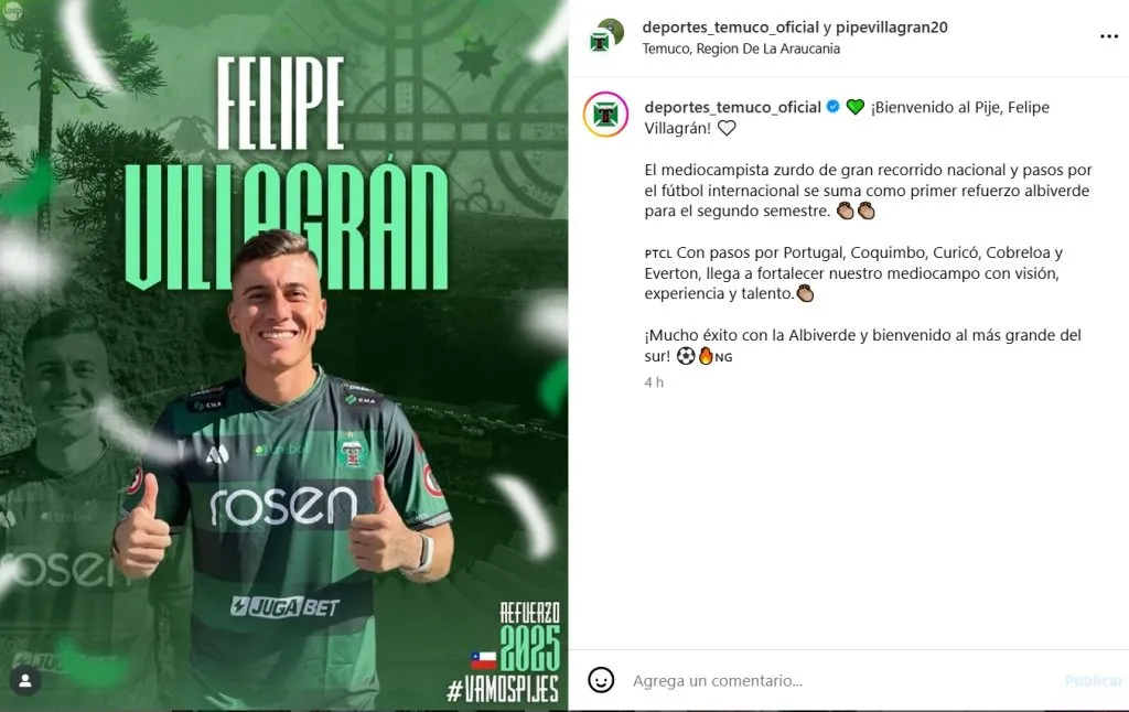 “¡Bienvenido al Pije, Felipe Villagrán! El mediocampista zurdo de gran recorrido nacional y pasos por el fútbol internacional se suma como primer refuerzo albiverde para el segundo semestre. Con pasos por Portugal, Coquimbo, Curicó, Cobreloa y Everton, llega a fortalecer nuestro mediocampo con visión, experiencia y talento”, informó el equipo de la Región de la Araucanía.