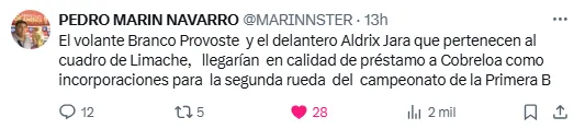 “El volante Branco Provoste y el delantero Aldrix Jara que pertenecen al cuadro de Limache, llegarían en calidad de préstamo a Cobreloa como incorporaciones para la segunda rueda del campeonato de la Primera B”, declaró.