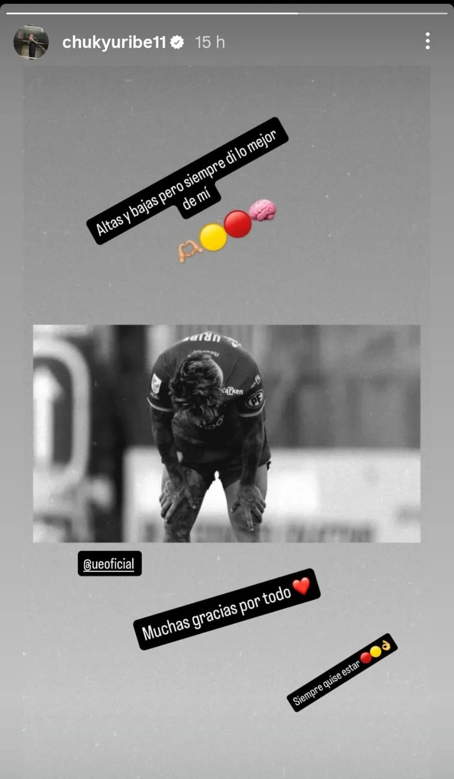 “Muchas gracias por todo” y “siempre quise estar” remarcó el formado en Santiago Wanderers dejando entrever el futbolista quien todavía tiene contrato con Unión Española hasta 2027.