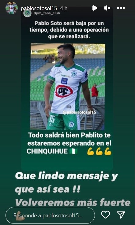 A través de su cuenta de Instagram, Pablo Soto agradeció el apoyo de un fanpage de los ‘Delfines’luego de que se conozca su delicada situación: “Todo saldrá bien Pablito, te estaremos esperando en el Chinquihue”. Sobre esta publicación, el futbolista agradeció: “Que lindo mensaje y que así sea. Volveremos más fuerte“.