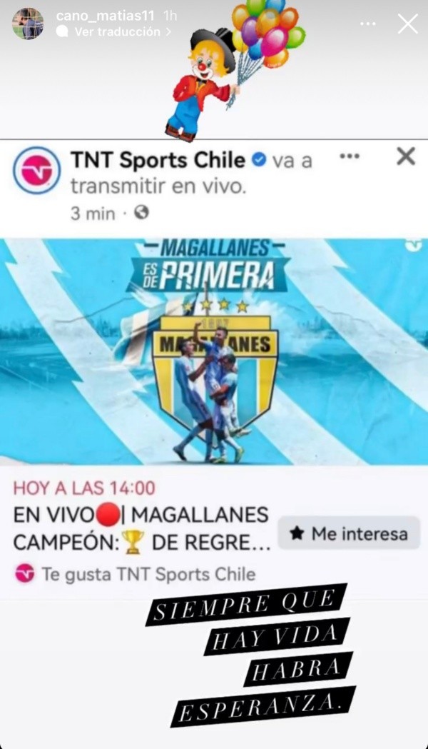 El meta de Cobreloa en sus Stories de Instagram escribió “siempre que hay vida habrá esperanza”. Además, el transandino colocó un payaso con varios globos y la publicación con el mensaje: “Magallanes es de Primera”.