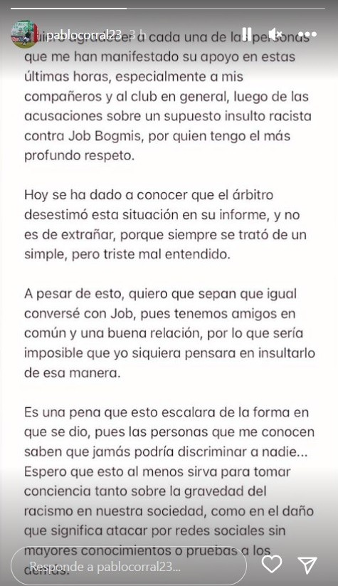 Una vez dicho esto, Corral se defendió: “Hoy se ha dado a conocer que el árbitro desestimó esta situación en su informe, y no es de extrañar, porque siempre se trató de un simple, pero triste mal entendido. Conversé con Job, pues tenemos amigos en comúny una buena relación, por lo que sería imposible que yo siquiera pensara en insultarlo de esa manera“.