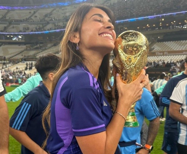 Antonela Roccuzzo levantó la Copa del Mundo junto a su esposo Lio Messi en Qatar (Instagram)