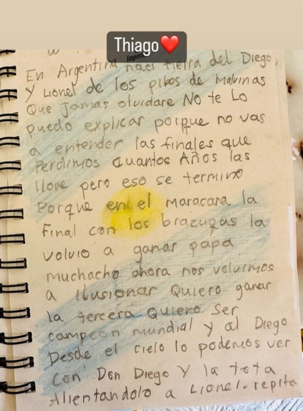 El chico de 10 años recuerda las penas y alegrías que ha vivido su padre con Argentina. “No vas a entender las finales que perdimos cuantos años. Las lloré, pero eso se terminó porque en el Maracaná la final con los Brazucas la volvió a ganar papá”.