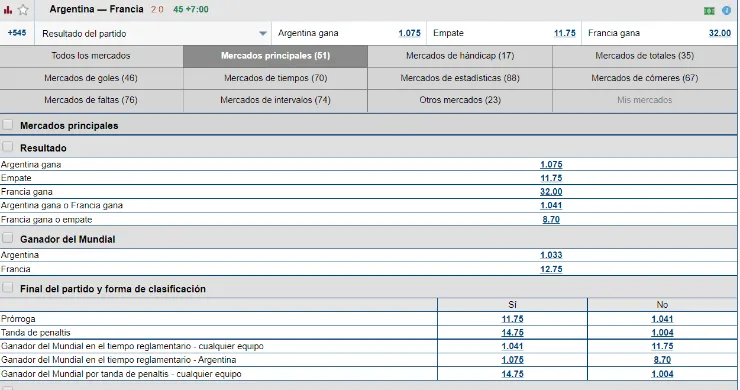 Con Marathonbet tienes cientos de opciones para jugar en esta final de Qatar 2022. De hecho, Argentina es el amplio favorito para ganar el compromiso por sobre Francia, sin importar el mercado que puedes ir analizando al momento de la mano de Marathonbet.