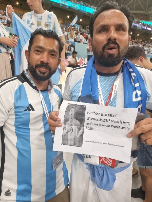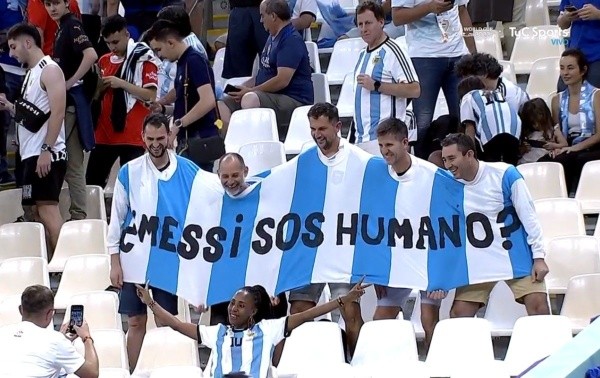 Desde temprano y durante el partido, se pudo apreciar en las tribunas del Estadio Icónico de Lusail como iban llegando los aficionados y admiradores del crack del PSG. Camisetas, papelitos y una especie de corpóreoentre cinco muchachos que dictaba la prosa “¿Messi sos humano?. como dando a entender que Leo es de otra galaxia.