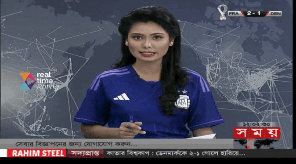 Incluso una comunicadora de la televisión deBangladesh se vistió con la camiseta suplente de Argentina para dar la noticia del partido de la albicesleste frente a México.