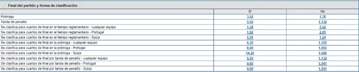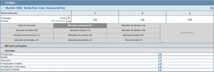 Con Marathonbet tienes cientos de opciones de jugar en este Mundial de Qatar 2022. Por ejemplo, si crees que Portugal gana el partido, paga 1,92 veces lo que juegues, por sobre los 5,05 que paga Suiza. Si eres de los que piensa que termina en empate, y por consiguiente alargue, paga 3,52 veces lo que apuestes.