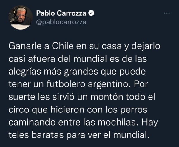 Cuando te toca, te toca, reza el dicho. Y es lo que le está pasando a Pablo Carrozza, periodista argentino que celebró más de una vez la eliminación de Chile del Mundial mandándonos a comprar teles para ver la Copa del Mundo.