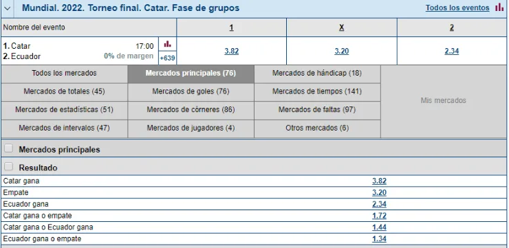 De paso, puedes aprovechar la gran variedad de mercados como si Qatar ganará o empatará, o si Ecuador iguala y luego triunfa en el primer partido de Qatar 2022.