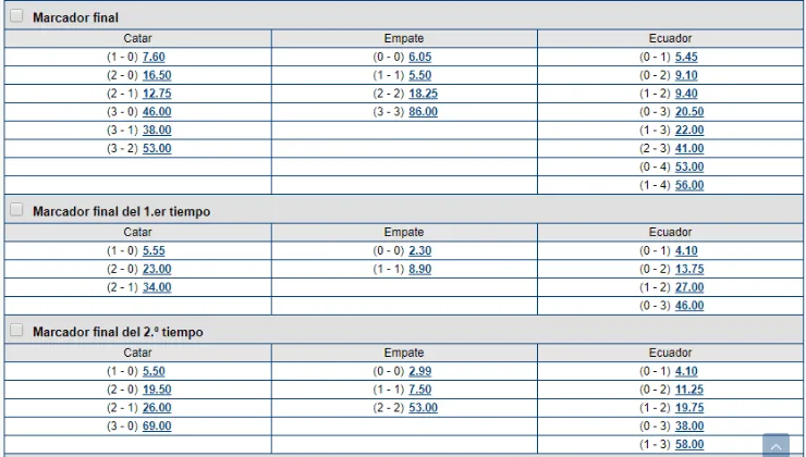 En otro mercado que puedes aprovechar de la mano de Marathonbet es el del marcador exacto con el que terminará el partido, el primer tiempo o el del segundo tiempo. Si crees que el Qatar vs Ecuador termina 0-1 a favor de los sudamericanos, paga 5,45 veces lo que apuestes, pero si eres de quienes piensa que termina en empate 1-1, el resultado paga 5,50 veces lo que juegues.