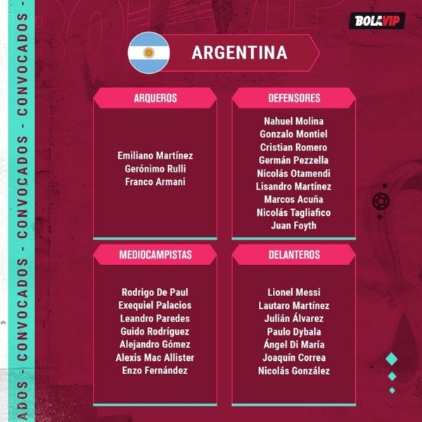 Las grandes dudas para Qatar 2022, pasaban por la presencia de Paulo Dybala y Ángel Di María. Ambos delanteros venían con molestias de la Roma y Juventus, respectivamente, con lo cual estaba en veremos su convocatoria. Finalmente, Lionel Scaloni los ratificó dentro de los 26 futbolistas que van a la Copa del Mundo.