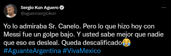 Las respuestas defendiendo a la pulga no se hicieron esperar, entre ellas está la del Kun Agüero, amigo de la Pulga. “Tu también cabrón… me escribías ay ay Canelo y ahora mamando no seas hipócrita cabrón”, respondió el mexicano.