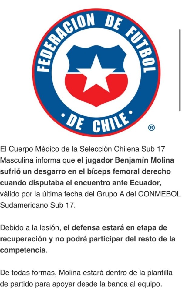 “El cuerpo médico de la selección chilena Sub 17 masculina informa queel jugador Benjamín Molina sufrió un desgarro en el bíceps femoral derecho cuando disputaba el encuentro ante Ecuador,válido por la última fecha del Grupo A del CONMEBOL Sudamericano Sub 17”, detallan.