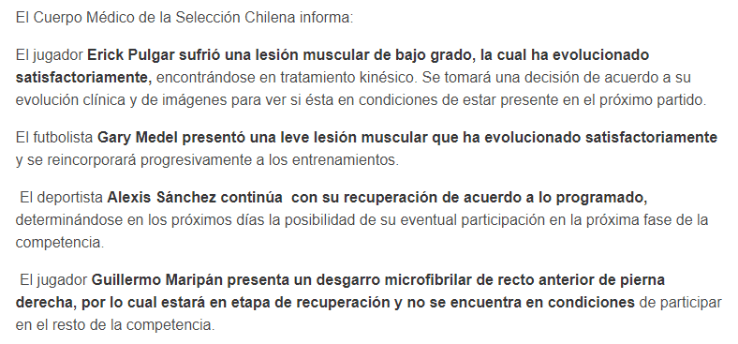 No obstante, las problemáticas están en la zona defensiva del equipo donde Guillermo Maripán se pierde el resto de la Copa América, luego de haber sufrido un desgarro microfibrilar de recto anterior en su pierna derecha, lo cual le impide ser parte de los próximos desafíos en la competencia.