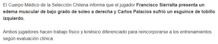A través de las redes sociales se dio a conocer el parte médico de los dos jugadores que presentaron lesiones en este inicio del torneo. Francisco Sierralta presenta un edema muscular de bajo grado en el soleo de la derecha, por lo que no estuvo en la nómina de la Selección Chilena.
