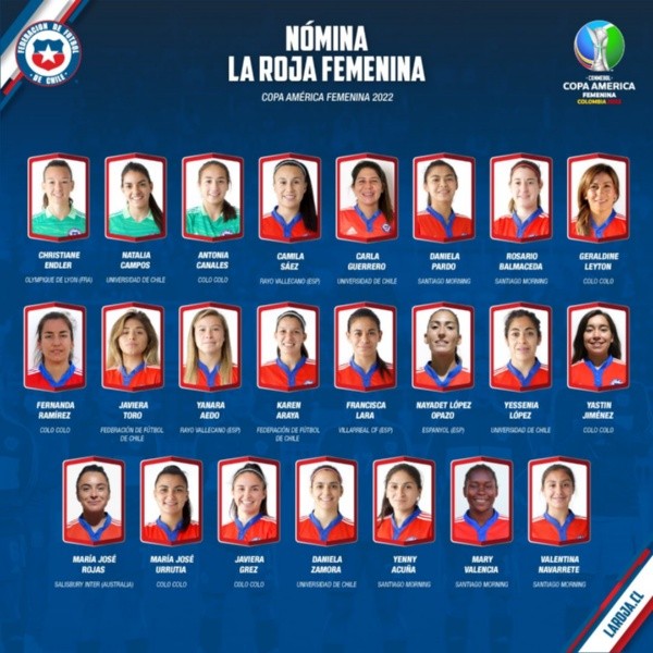 La nómina comienza con las arquerasChristiane Endler (Olympique de Lyon), Natalia Campos (Universidad de Chile) y Antonia Canales (Colo Colo).