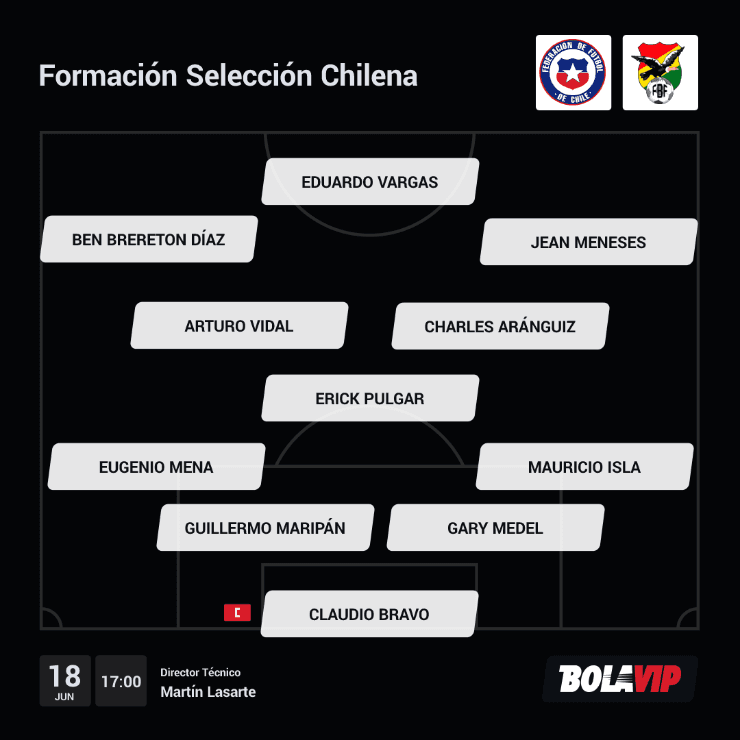 De esta manera, el equipo saldría con Claudio Bravo; Mauricio Isla, Gary Medel, Guillermo Maripán, Eugenio Mena; Erick Pulgar, Arturo Vidal, Charles Aránguiz; Jean Meneses, Eduardo Vargas y Ben Brereton Díaz.