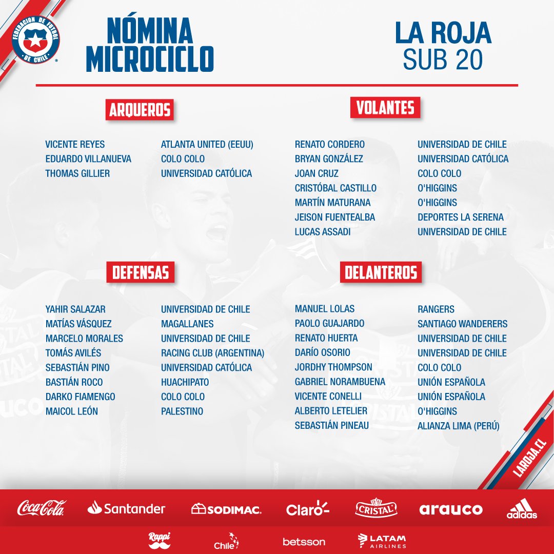 Volantes:Renato Cordero (Universidad de Chile), Bryan González (Universidad Católica), Joan Cruz (Colo Colo), Cristóbal Castillo (O’Higgins), Jeison Fuentealba (Universidad de Chile), Lucas Assadi (Universidad de Chile) y Martín Maturana(O’Higgins).