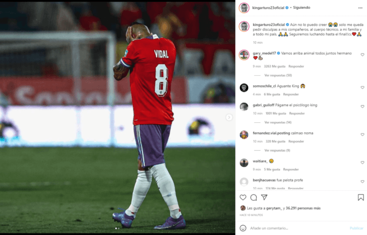 “Aún no lo puedo creer. Solo me queda pedir disculpa a mis compañeros, cuerpo técnico, a mi familia y a todo mi país. Seguiremos luchando hasta el final”, fueron las palabras que compartió Arturo Vidal en su cuenta de Instagram.